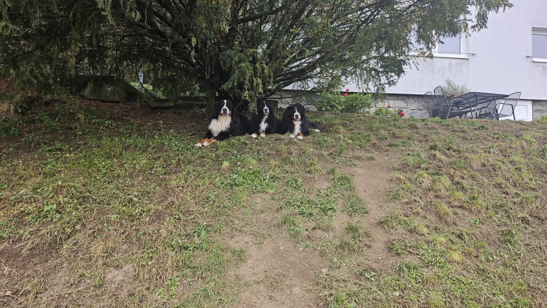 Letošní léto je poněkud deštivé, jak začaly prázdniny, začaly i deště a chladné dny. Chlad smečce nevadí, spíš naopak, ale déšť nemají rádi. Ani muškátům déšť nesvědčí, mokré květy hned hnědnou a plesniví, moc parády letos nedělají, jsou jen velké jako vždy. Smečka se drží u domu, na mokrou trávu se jim nechce a hlídají hlavně kdy se otevřou dveře domů. Ale přeje jen máme úspěch - po roce a půl u nás se Akoušek (3r9m a 57 kg) konečně přestal v panice utíkat před objektivem. Teď už utíká jen při vyslovení jakéhokoliv povelu ale upřímně...u nás se moc povelů psům nedává a na zavolání k jídlu přijde okamžitě tak co už