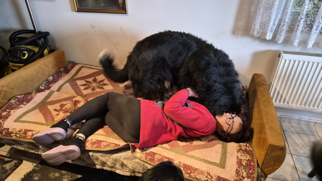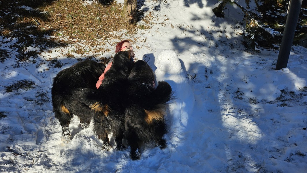 Konečně jsme se dočkali sněhové pokrývky dostačující na výrobu "psího" sněhuláka, kterého jsme měli naposledy v roce 2023, od té doby nikdy nenapadlo dost "materiálu". Od roku 2013 do r. 2022 se to vždy podařilo. Ale pod té dlouhé pauze jsme nějak vyšli ze cviku a tak ten letošní sněhový pejsek je trochu obézní - asi jako by tady u nás i vyrostl