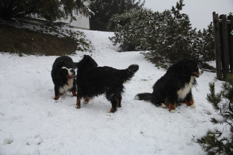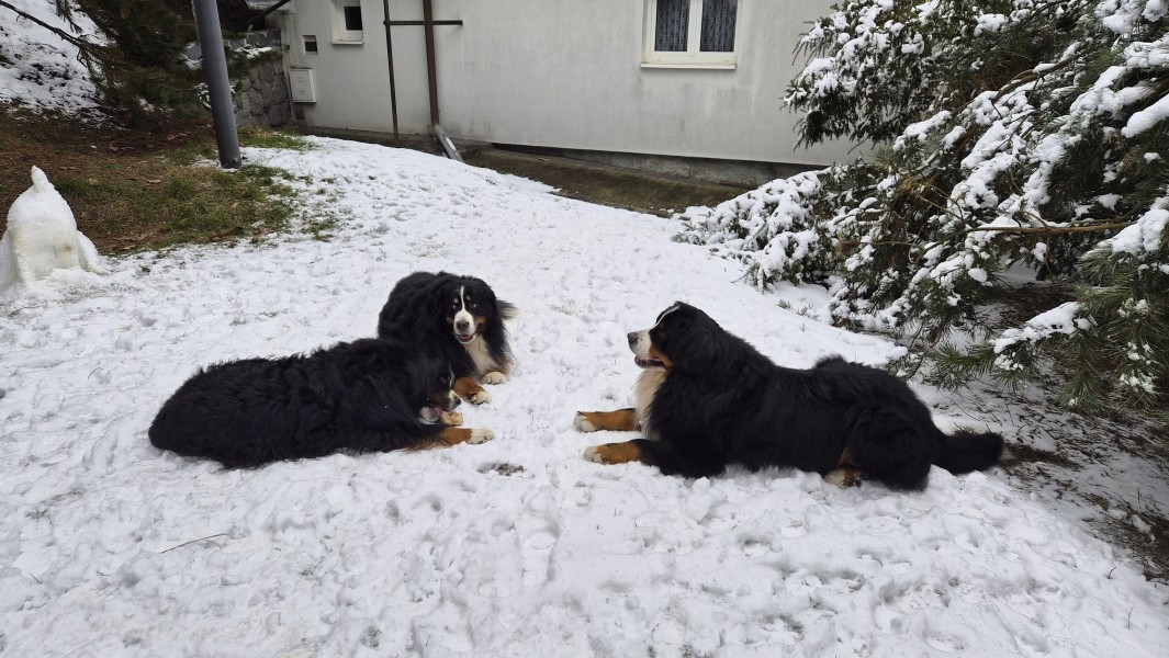 Největší radost z bílé nadílky má Aki, Delinka si vyprala kožíšek a Boruška ? No, je to mokrý... takže nic moc