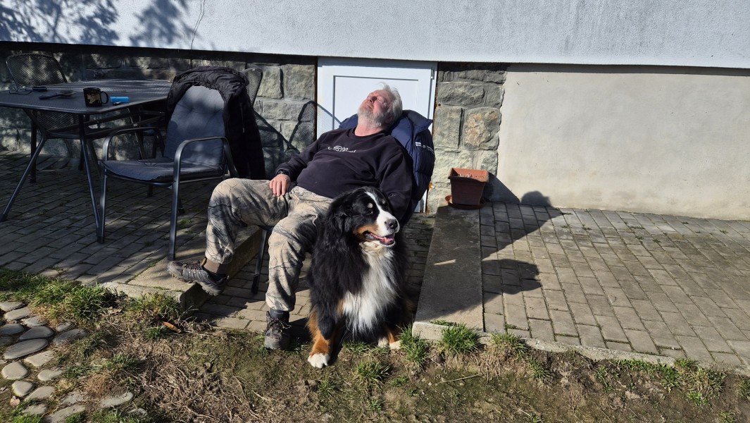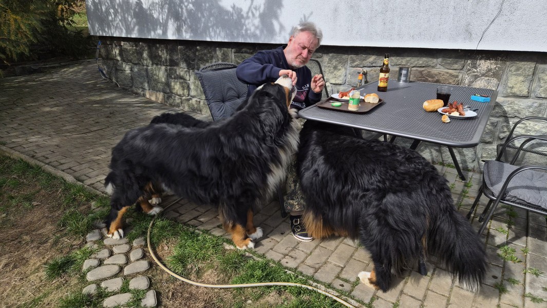 Jarní počasí pokračuje i tento víkend. Vyčesat Akouše je nutné, on to ale vidí jinak. Úspěch je, že při spatření kartáče neprchá na druhý konec zahrady ale vleze si do bezpečí vyhrabané jámy pod nízko rostoucí větve takže česání probíhá ve svahu, v sedě na bobku a neustálém balancování a vyrovnávání zemské přitažlivosti. A grilování ? To se bez psů neobejde takže... pokud hodláme jíst venku - příliš se nenajíme. Jestoi ta zima není lepší