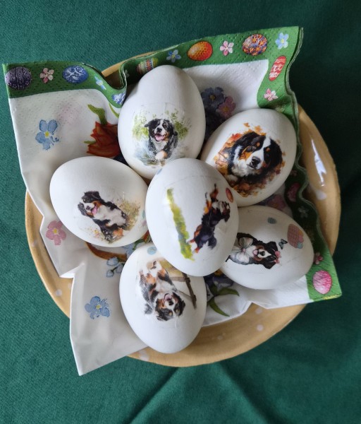 Letošní velikonoce patřily bezvýhradně smečce. Žádné výjezdy, žádné návštěvy, berňáci byli i na velikonočních kraslicích. Počasí bylo... různé, i když to na fotkách tak nevypadá, rozdíl 15 stupňů ze dne na den, ráno jinovatka, trochu deště - kromě sněhu cokoliv